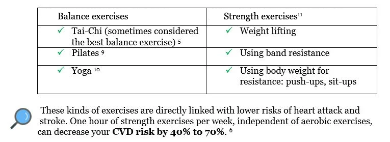 Balance exercises help reduce the risk of falls and injuries, while strength exercises work the muscles and reduce body weight.