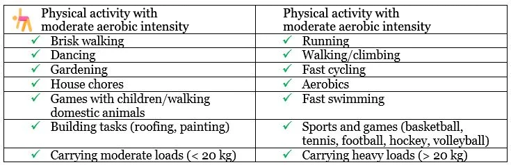Did you know? According to the latest WHO guideline – It is recommended for adults to do at least 150–300 minutes of moderate-intensity aerobic physical activity; or at least 75–150 minutes of vigorous-intensity aerobic physical activity; or an equivalent combination of moderate- and vigorous-intensity activity throughout the week, for substantial health benefits.3 |